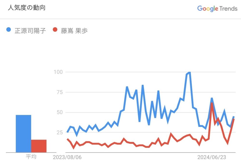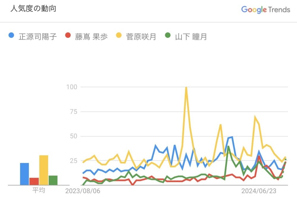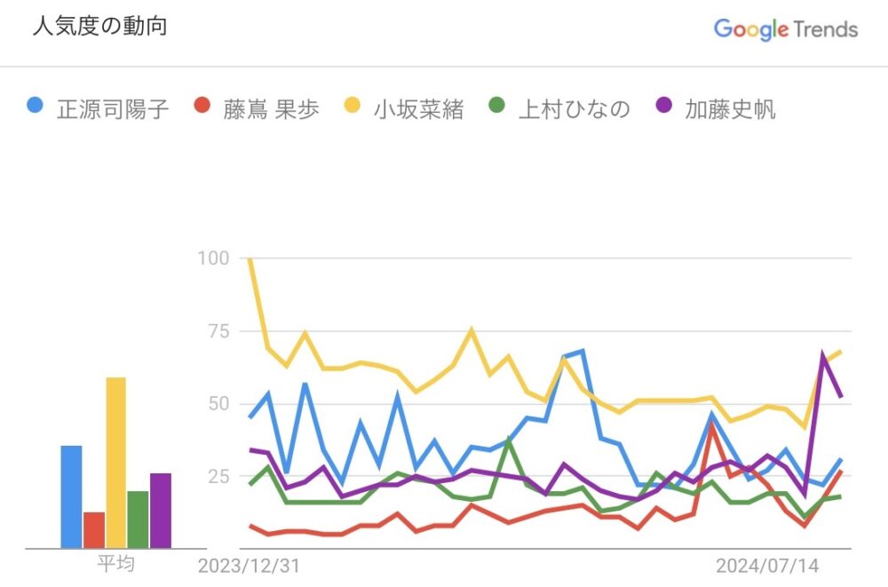 グーグルトレンドは人気度の高いメンバーを基準にグラフが生成されるので、乃木坂は井上和ではなく菅原咲月を採用。