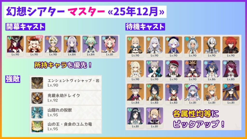 | 感想 | 全体的にキャラが不足 氷キャラが課題 |