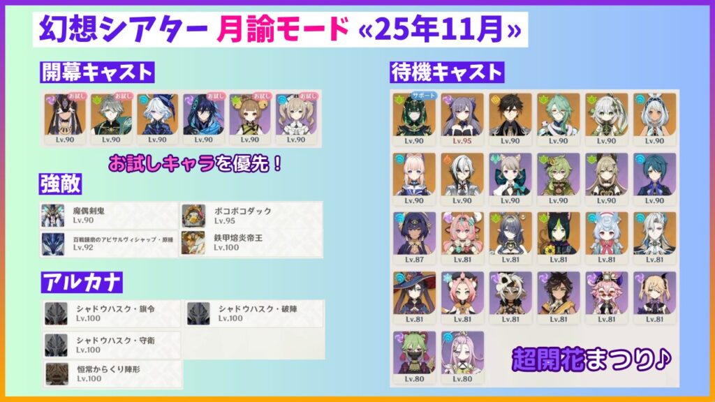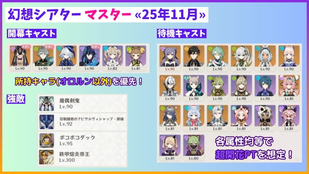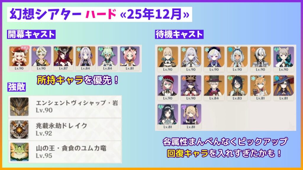 | 感想 | 通常で苦戦 開幕キャストを急遽育成 雷キャラがちょっと心もとない |